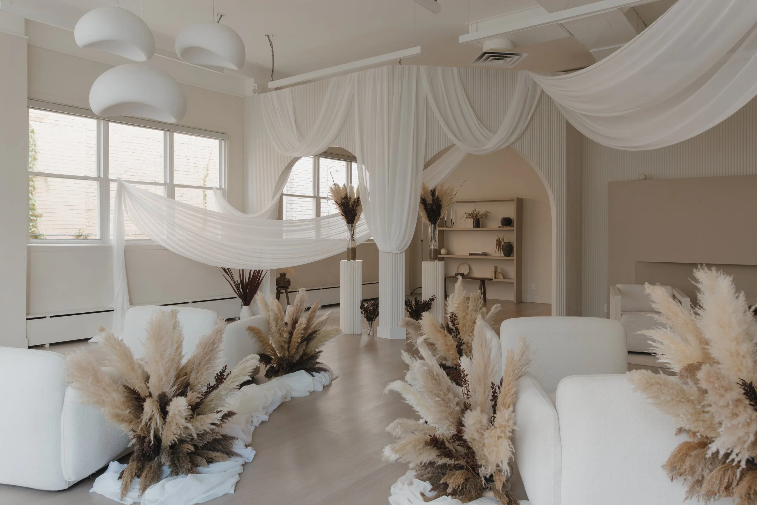 Hosted at Largo’s Loft, a natural light studio and micro wedding venue in downtown St. Catharines, Niagara, this intimate celebration was styled with Pinterest-inspired draping, neutral dried florals, and a soft, airy ceremony setup. The look was minimal but elevated: warm tones, clean lines, and timeless details that photographed beautifully in natural light.